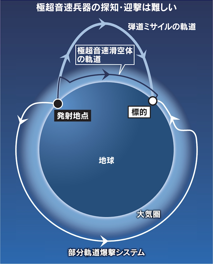 極超音速兵器 音速の5倍にあたるマッハ5以上の「極超音速」で、弾道ミサイルとは異なる低い軌道を長時間飛行する。機動的で変則的な動きをすることから、従来のミサイル防衛システムでは迎撃が極めて難しい。打ち上げたロケットから分離して攻撃目標まで飛行する「極超音速滑空体」と、空気を取り入れながら加速することが可能な「極超音速巡航ミサイル」の2種類がある。 (以下、日経新聞サイト参照)